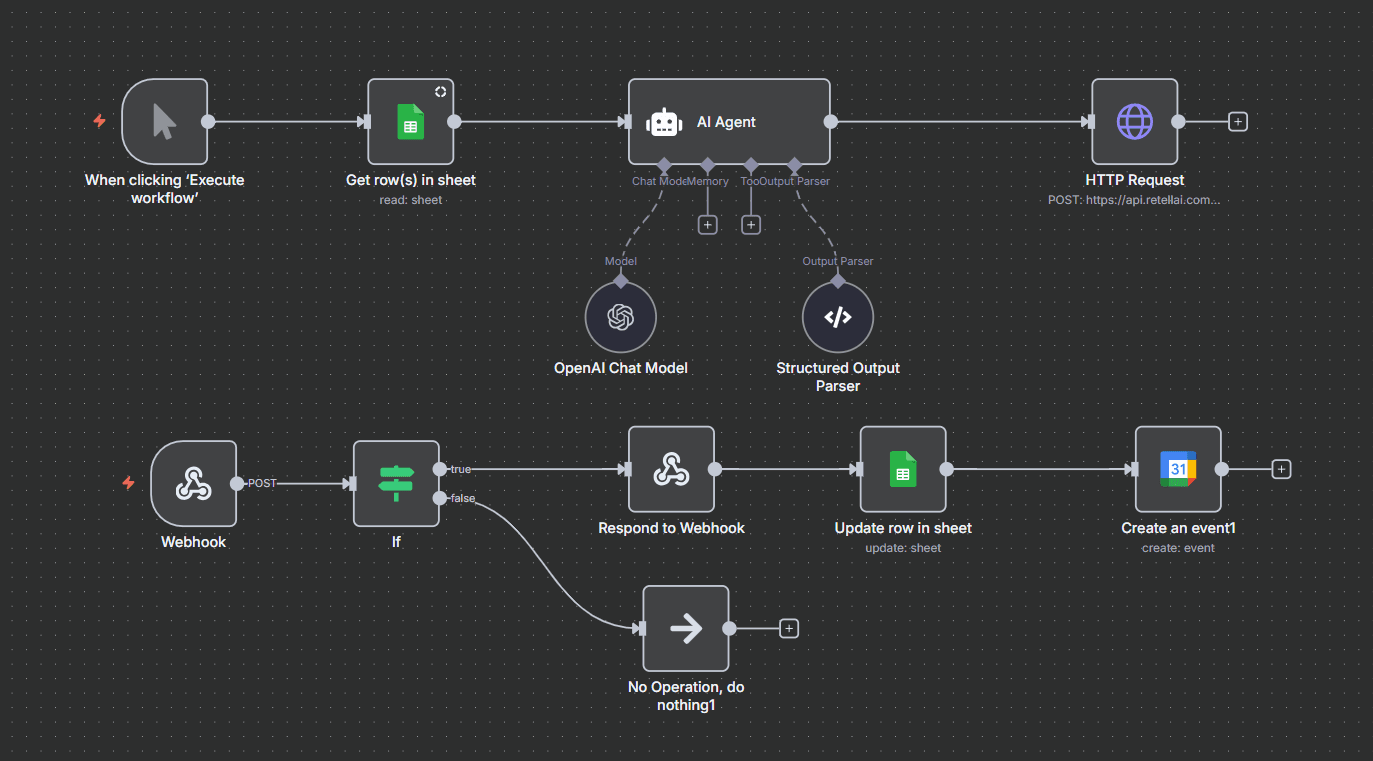 In our agency, we specialize in Voice AI solutions. Recently, we built a workflow that integrates Retell.ai (for voice AI intelligence) with Google Sheets and Google Calendar to create a seamless AI assistant that can read data, analyze it, and schedule events automatically.